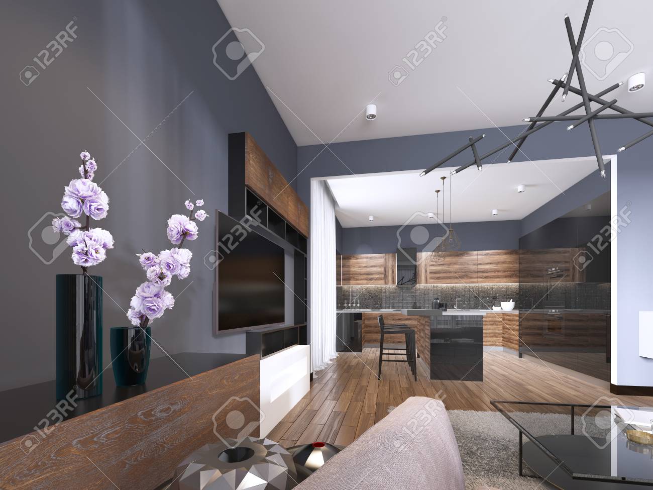 Studio Apartment Living Room With Fabric Sofa And Tv Storage Stock Photo Picture And Royalty Free Image Image 113377288 Living Room Tv Wall Inspiration